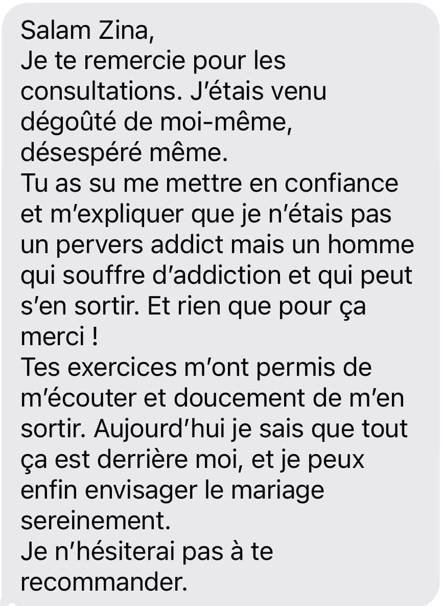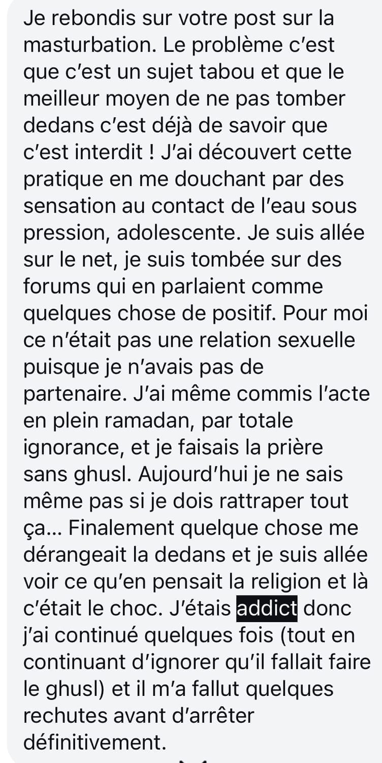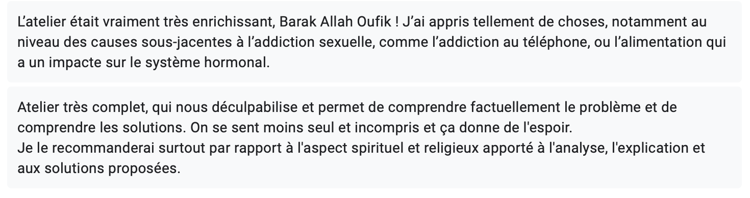 L'atelier a pour objectif d'expliquer ce qu'est l’addiction à la masturbation et/ou pornographie ainsi que ses conséquences chez la personne qui souffre de ces pratiques et sur son époux/se. Très certainement que tu comprendras pourquoi ta vie intime a été difficile et tu recevras les informations et outils nécessaires pour envisager à nouveau le mariage 💕
